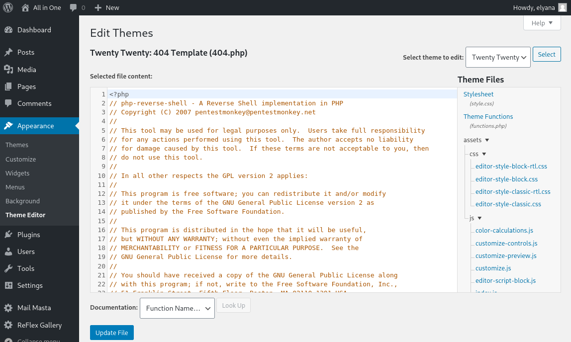Using the theme editor we can insert our own malicious PHP to get a reverse shell back. We put it into the 404 page so we can trigger it by visiting an non existing page.